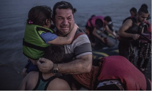 Laith Majid with youngest child, overcome on arriving safely in Greece. Safe now in Germany